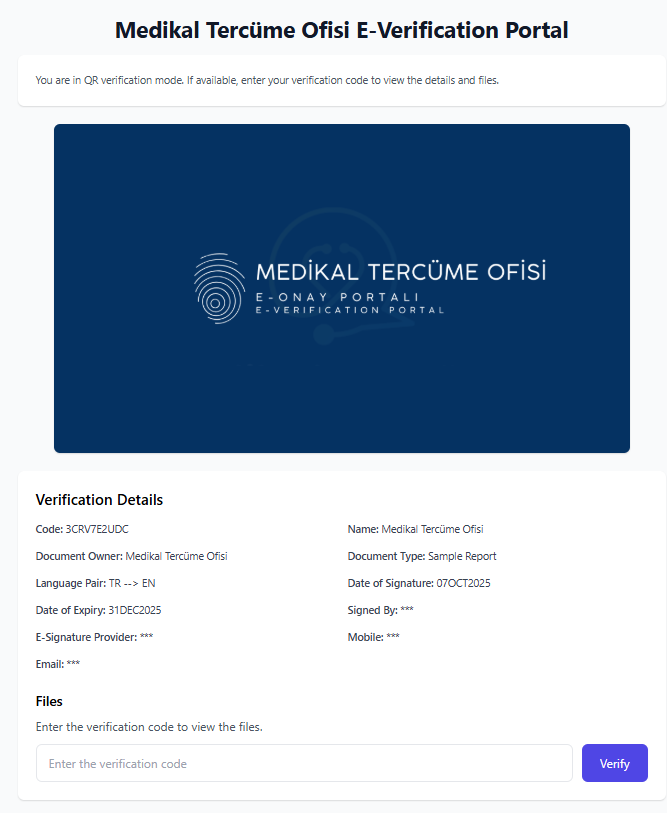 At Medikal Tercüme Ofisi, we make your translations legally valid by having them prepared by sworn, expert medical translators and signed with a secure electronic signature (e-Signature). Each document is assigned a unique QR code and a personal verification code, making the entire process transparent, fast, and fully traceable. We call this integrated structure the e-Verification System.